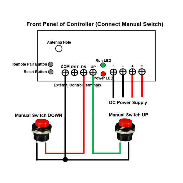 2) Connect two terminals of the UP button to the terminals <UP> and <COM> on the controller, and connect two terminals of the DOWN button to the terminals <DOWN> and <COM> on the controller.