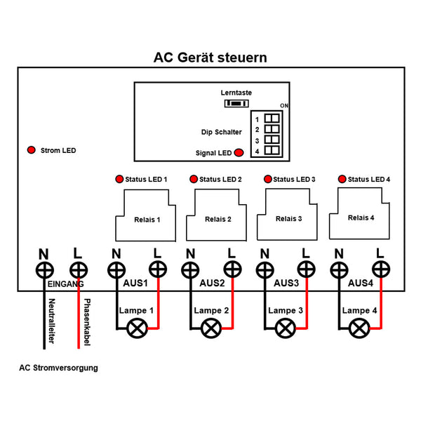 Press the button D on the transmitter: The relay 4 in the receiver is activated, and the connected lamp 4 is turned on.