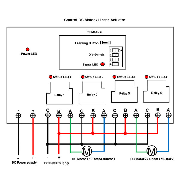 This receiver is an electric device with 4 dry relay outputs, it and the transmitter form a wireless remote-control system. This system can remote control DC motor or linear actuator. If you connect a DC motor to this receiver, you can operate the motor to rotate in positive or reversal direction by using the remote control. If you connect a DC linear actuator to this receiver, you can operate the linear actuator to extend or retract by using the remote control.