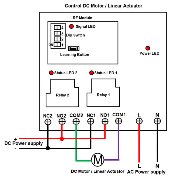 This receiver is an electric device with 2 dry relay outputs, it and the transmitter form a wireless remote-control system. This system can remote control DC motor or linear actuator. If you connect a DC motor to this receiver, you can operate the motor to rotate in positive or reversal direction by using the remote control. If you connect a DC linear actuator to this receiver, you can operate the linear actuator to extend or retract by using the remote control.