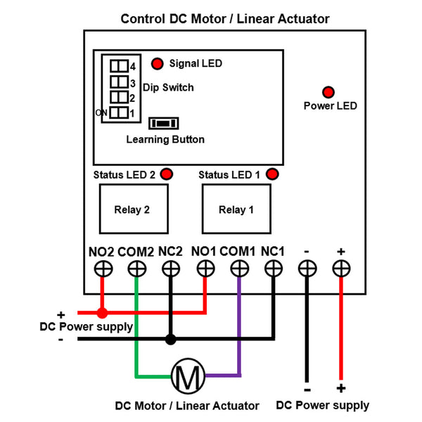 This receiver is an electric device with 2 dry relay outputs, it and the transmitter form a wireless remote-control system. This system can remote control DC motor or linear actuator. If you connect a DC motor to this receiver, you can operate the motor to rotate in positive or reversal direction by using the remote control. If you connect a DC linear actuator to this receiver, you can operate the linear actuator to extend or retract by using the remote control.