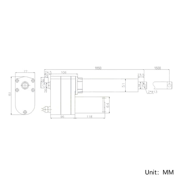 Rretraction Length: When the linear actuator is fully retracted, the center distance between the two mounting holes is 1850MM.