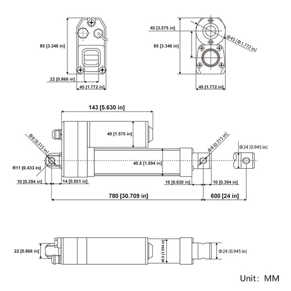 Rretraction Length: When the linear actuator is fully retracted, the center distance between the two mounting holes is 780MM.
