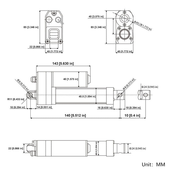 Rretraction Length: When the linear actuator is fully retracted, the center distance between the two mounting holes is 140MM.