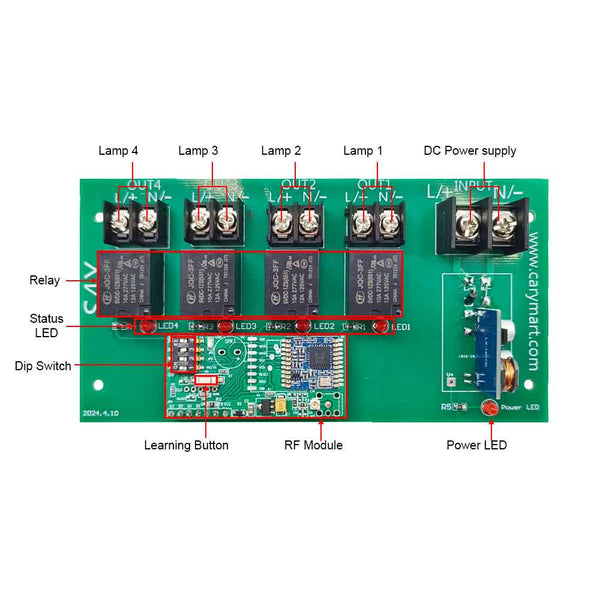 This receiver is an electric device with 4 channels DC power outputs, it and the transmitter form a wireless remote-control system. This system may be used in all types of industry automation, agriculture, business, home, factory, house, farm, garage, vehicle, ship, aerial vehicle, etc. It can remote control different DC equipment on land, water, and air, such as lights, doors, windows, lamps, sockets, locks, sirens, outlets, heaters, motors, fans, winches, curtains, blinds, linear actuators, electric solenoid valves, and security alarm systems. The applications are endless.