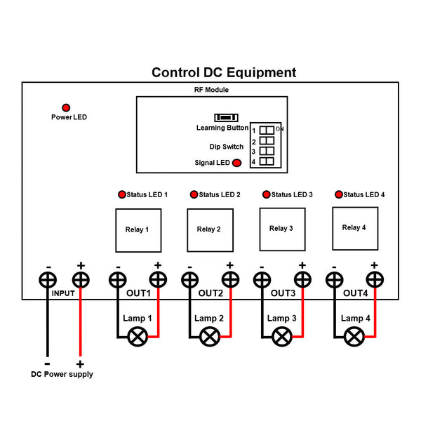 Press the button D on the transmitter: The terminals <OUT4> outputs DC power, and the connected lamp 4 is turned on. Other 3 terminals stop outputting, and other 3 connected lamps are turned off.
