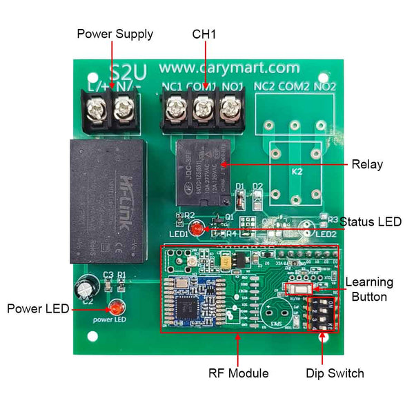 This receiver is an electric device with dry relay output, it and the transmitter form a wireless remote-control system. This system may be used in all types of industry automation, agriculture, business, home, factory, house, farm, garage, vehicle, ship, aerial vehicle, etc. It can remote control different AC or DC equipment on land, water, and air, such as lights, doors, windows, lamps, sockets, locks, sirens, outlets, heaters, motors, fans, electric solenoid valves, and security alarm systems. The applications are endless.