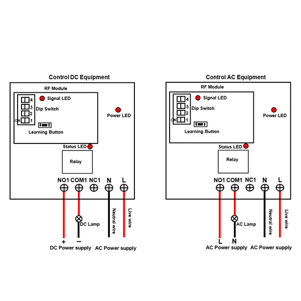 Relay Output: This receiver is dry relay output; it can be used to operate both DC and AC equipment. The output terminals are NO / NC (normally open / normally closed), serving as a switch.