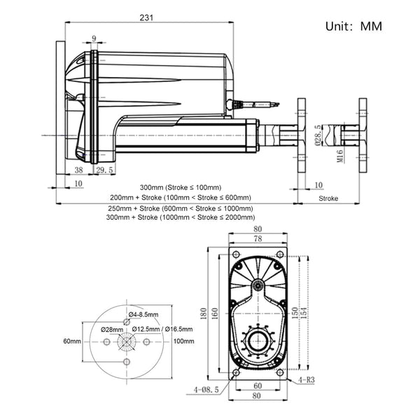 If you order them together, we will flatten the mounting hole part of the rear connector of linear actuator F by using the milling machine, and customize the rear connector of the linear actuator F into the style with M27 external threads, and then fix this flat plate bracket to the bottom of linear actuator with an M27 nut, an M8 screw, and six M4 screws.