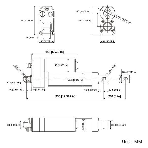 Rretraction Length: When the linear actuator is fully retracted, the center distance between the two mounting holes is 330MM.