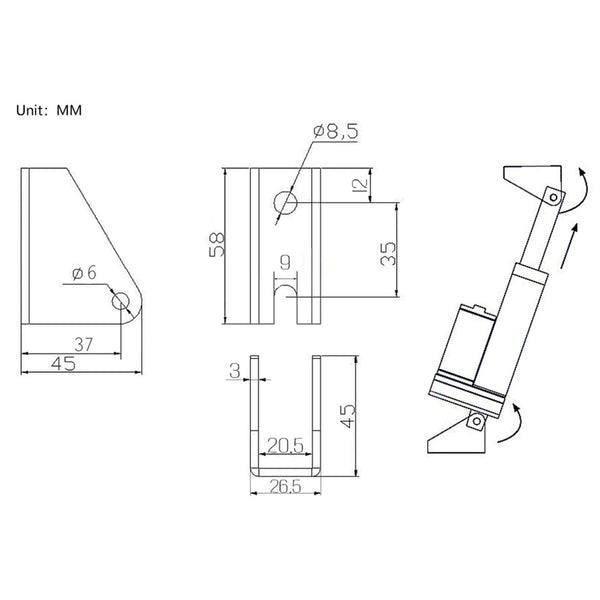 This mounting bracket can be installed on linear actuator A , and it can also be installed at the bottom of linear actuator D .