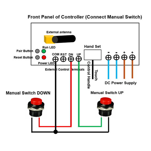 When you choose the manual switch function, you can connect one external manual switch (such as model 0040025) to this controller and then operate the linear actuators through it.