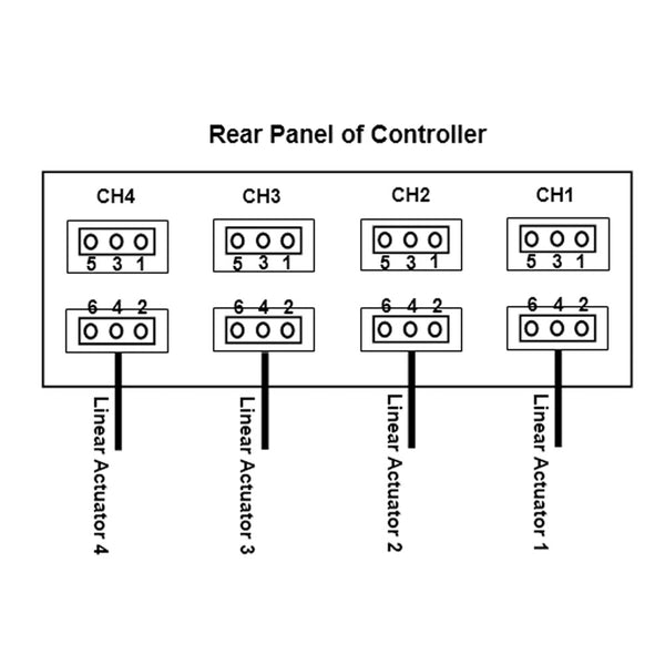2) As shown in the diagram, plug the two terminals of each of the four linear actuators into the two ports of CH1, CH2, CH3, and CH4 on the controller respectively.