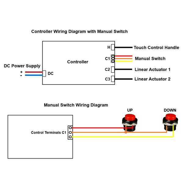 When you choose the manual switch function, you can connect one external manual switch (such as model 0040025) to this controller and then operate the linear actuators through it.