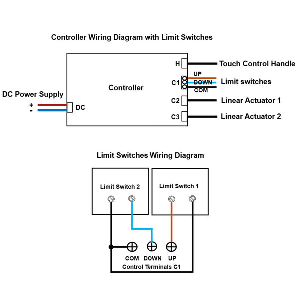 1) When two linear actuators extend outward, if a limit switch is triggered, it will connect two terminals <UP> and <COM>, then two linear actuators will stop automatically.