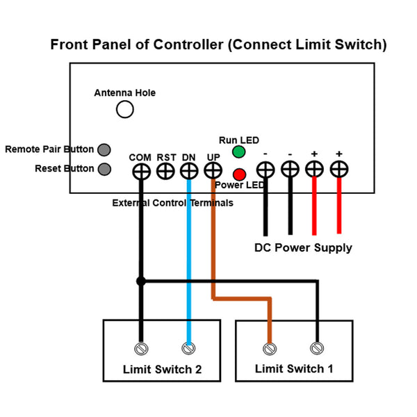 When you choose the limit switch function, you can connect two external limit switches with normally open contact (such as model 0010010) to this controller and then automatically stop the linear actuators through it.
