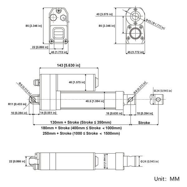 The stroke range of linear actuators is 0.4 ~ 60 inches or 10 ~ 1500 mm. We can also customize any stroke length from 10mm to 1500mm, such as 380mm, 750mm, 1250mm and so on.