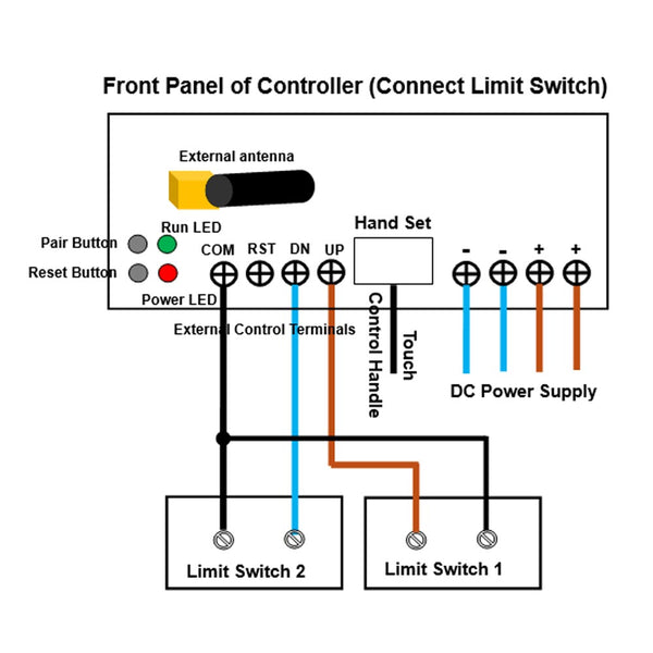 When you choose the limit switch function, you can connect two external limit switches with normally open contact (such as model 0010010) to this controller and then automatically stop the linear actuators through it.