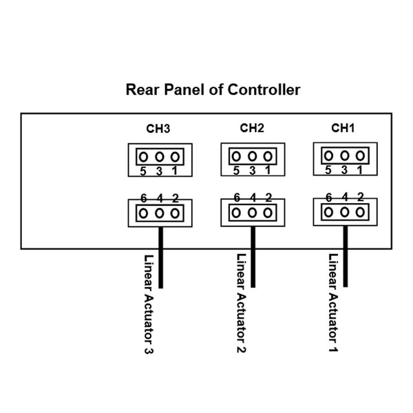 2) As shown in the diagram, plug the two terminals of each of the three linear actuators into the two ports of CH1, CH2, and CH3 on the controller respectively.